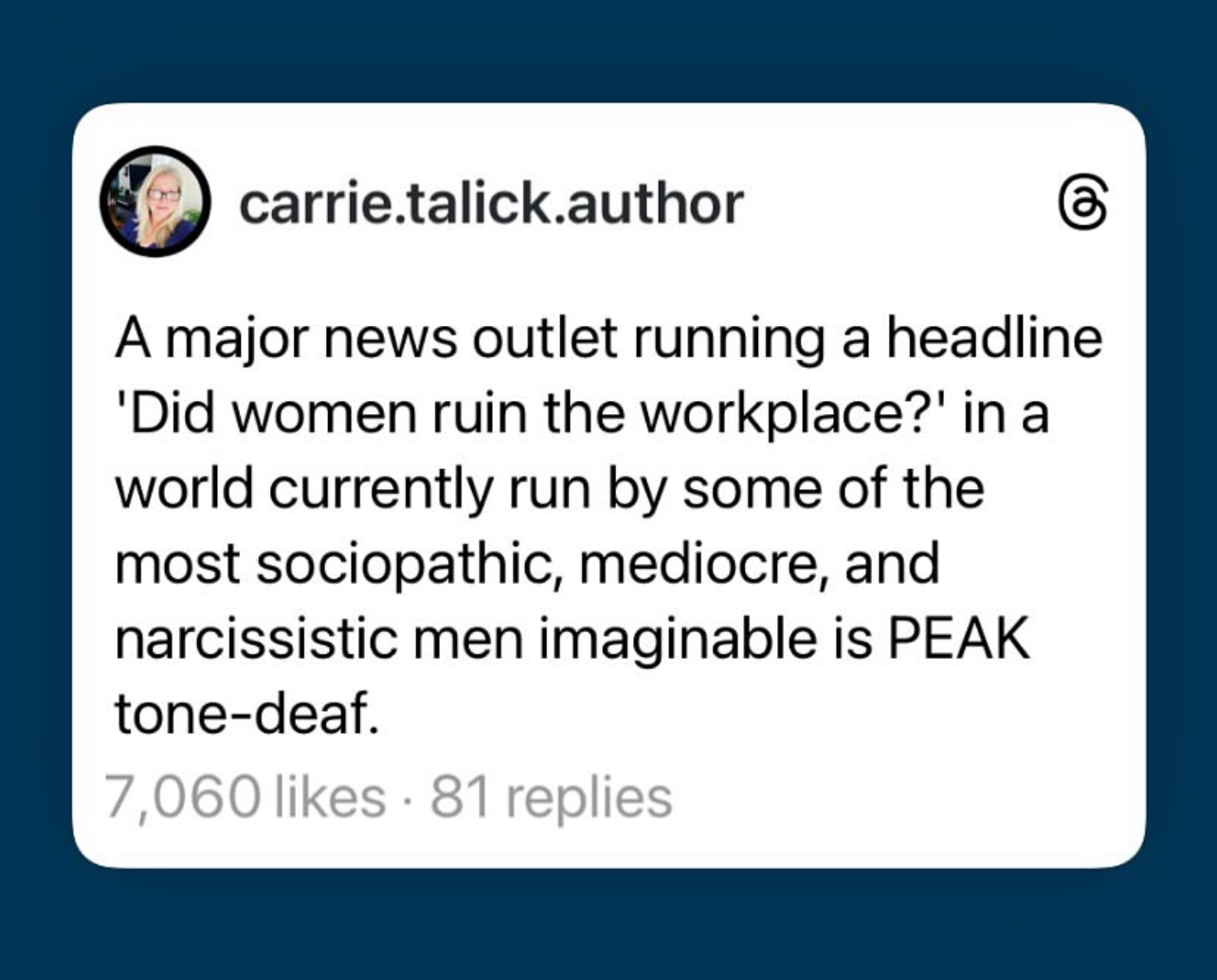 And yet, buried inside the horseshit and hand wringing, there are a few kernels worth examining, not because they support the central thesis, but because they dismantle the entire premise and point directly toward the unfinished work of feminism in the workplace.