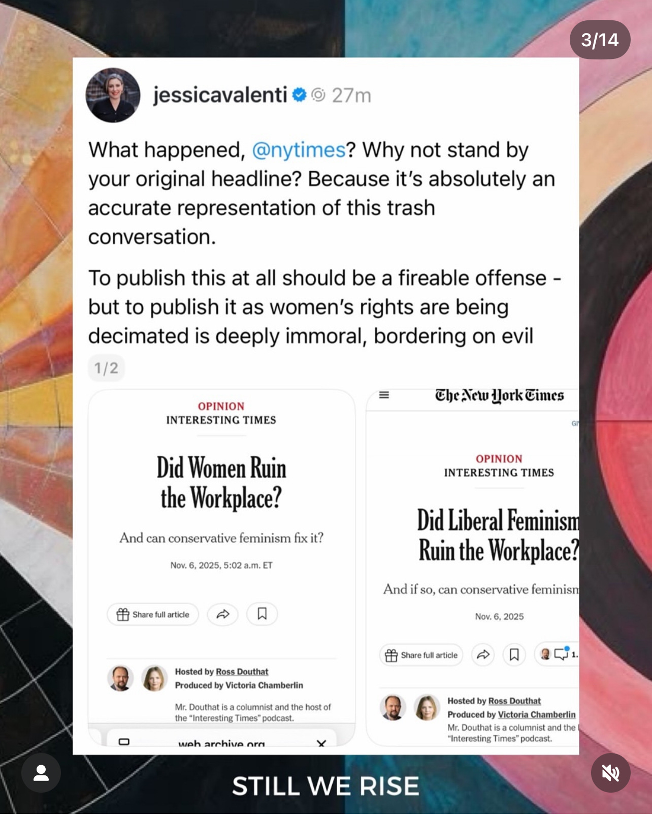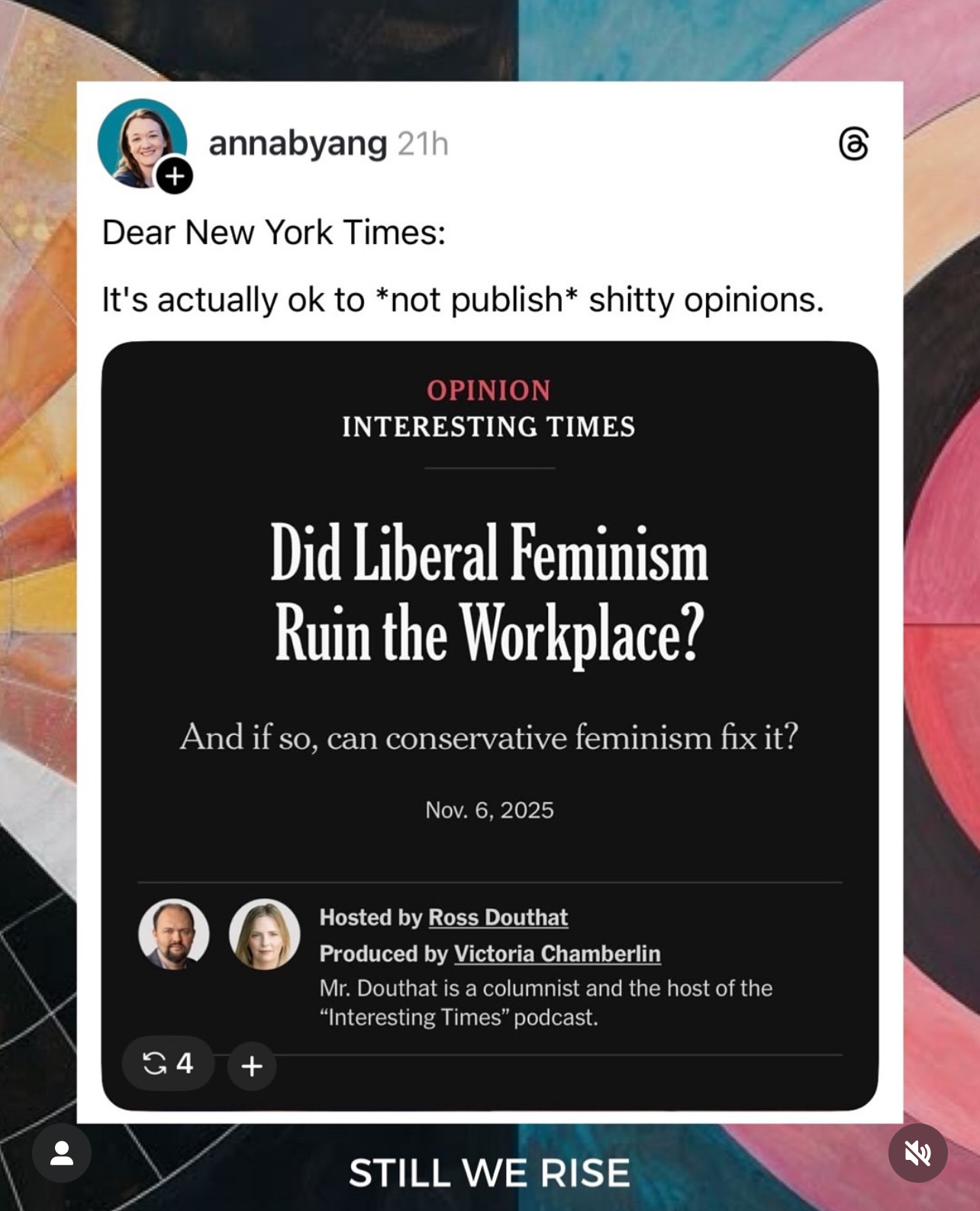 What Douthat and his guests cannot see, and what many progressives forget, is that feminism was never meant to make women fit better inside broken systems. It was meant to make those systems fit all humans better.