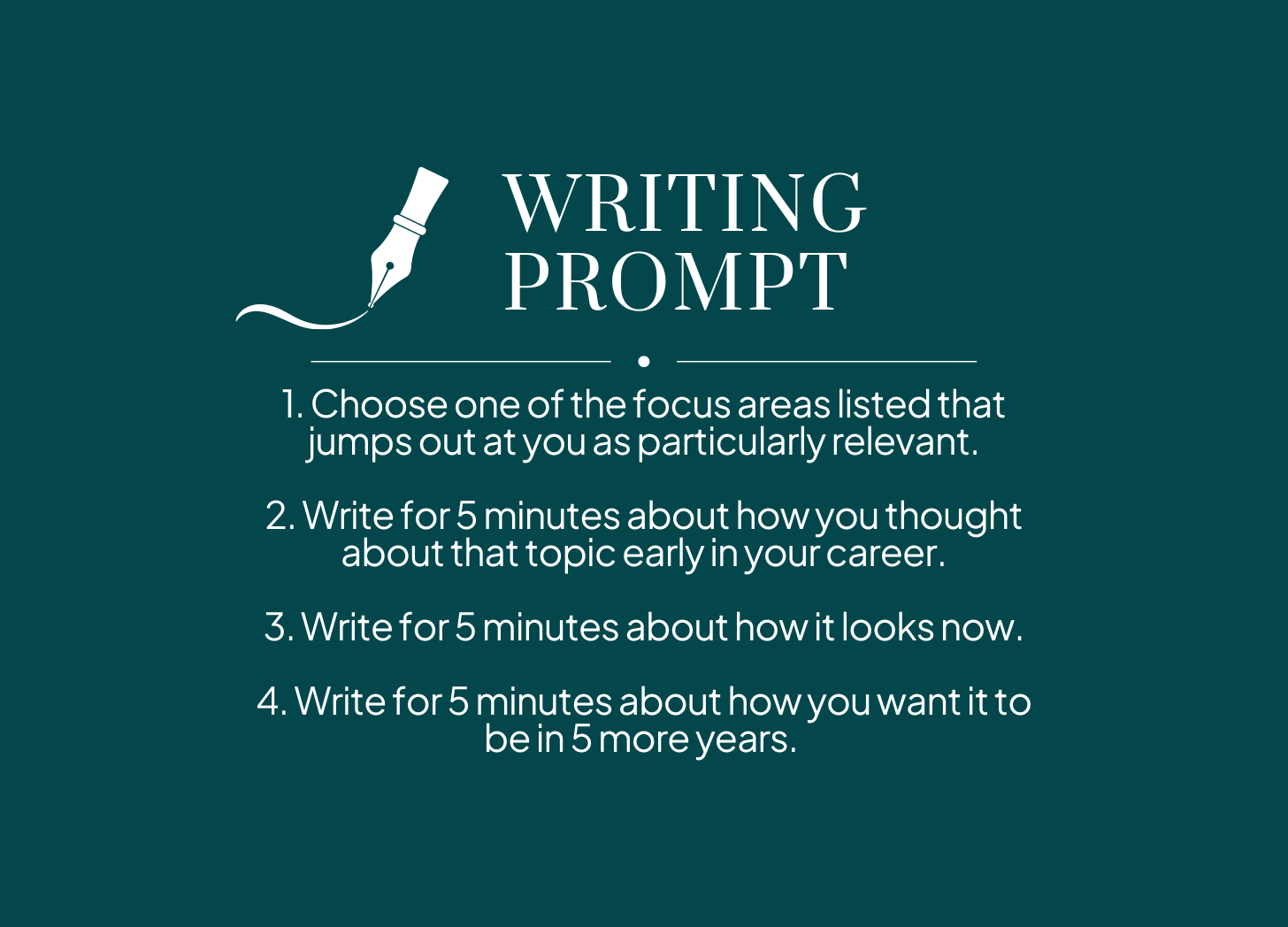 Choose one of the focus areas listed that jumps out at you as particularly relevant. Maybe you’re thinking a lot about legacy lately or team culture or navigating a particularly tough work relationship.